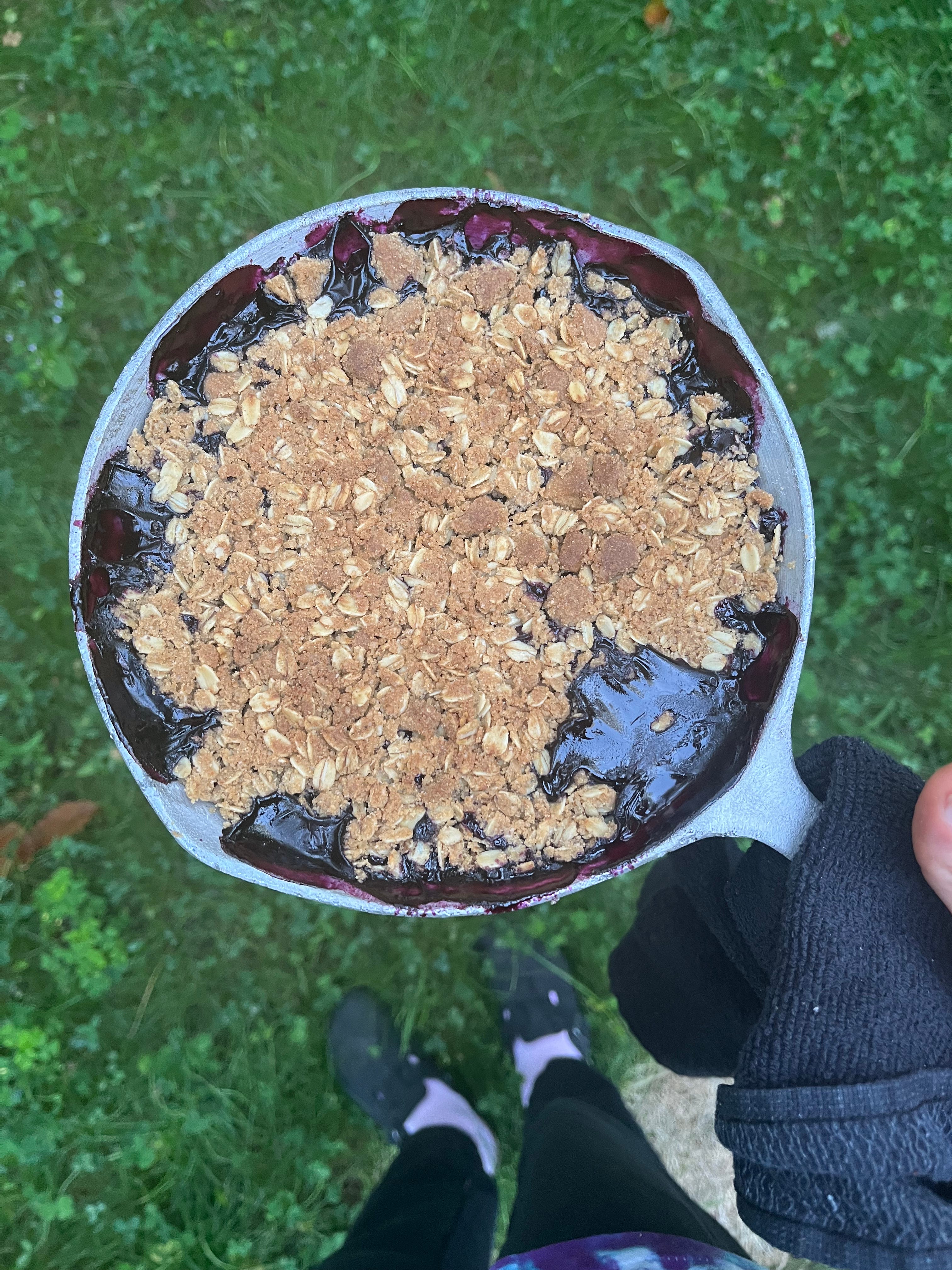 This ultra simple dessert tasted like the world’s best blueberry jam. I credit the quality of the berries and a random Airbnb pantry that lead to its genius. I had to use Sugar in the Raw packets pocketed from a coffee shop to sweeten and leftover S’mores graham cracker in the crumble. It looks like nothing, but man was it delicious.