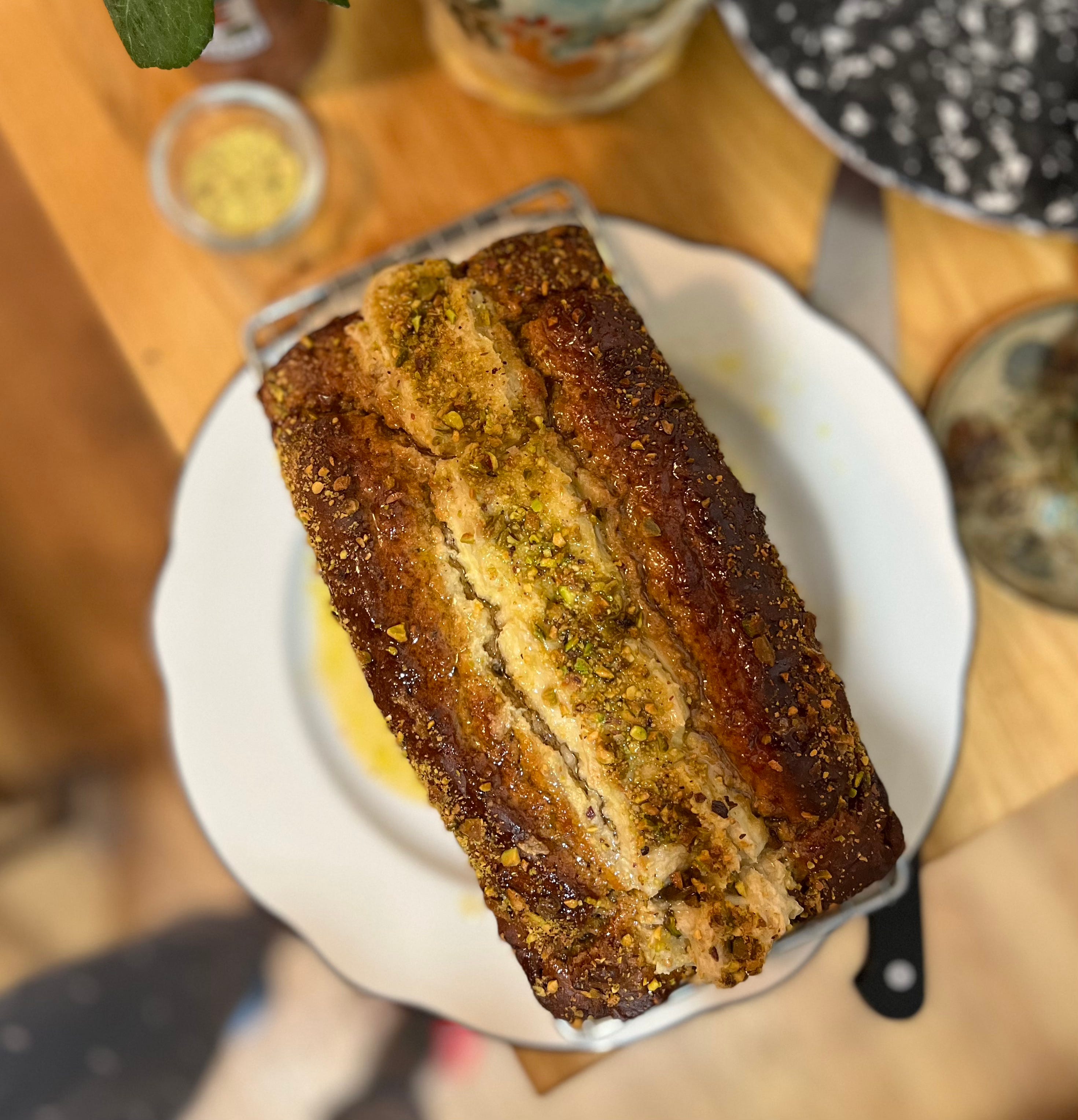 Miso Maple Pistachio Pound Cake with a Honey Olive Oil Glaze