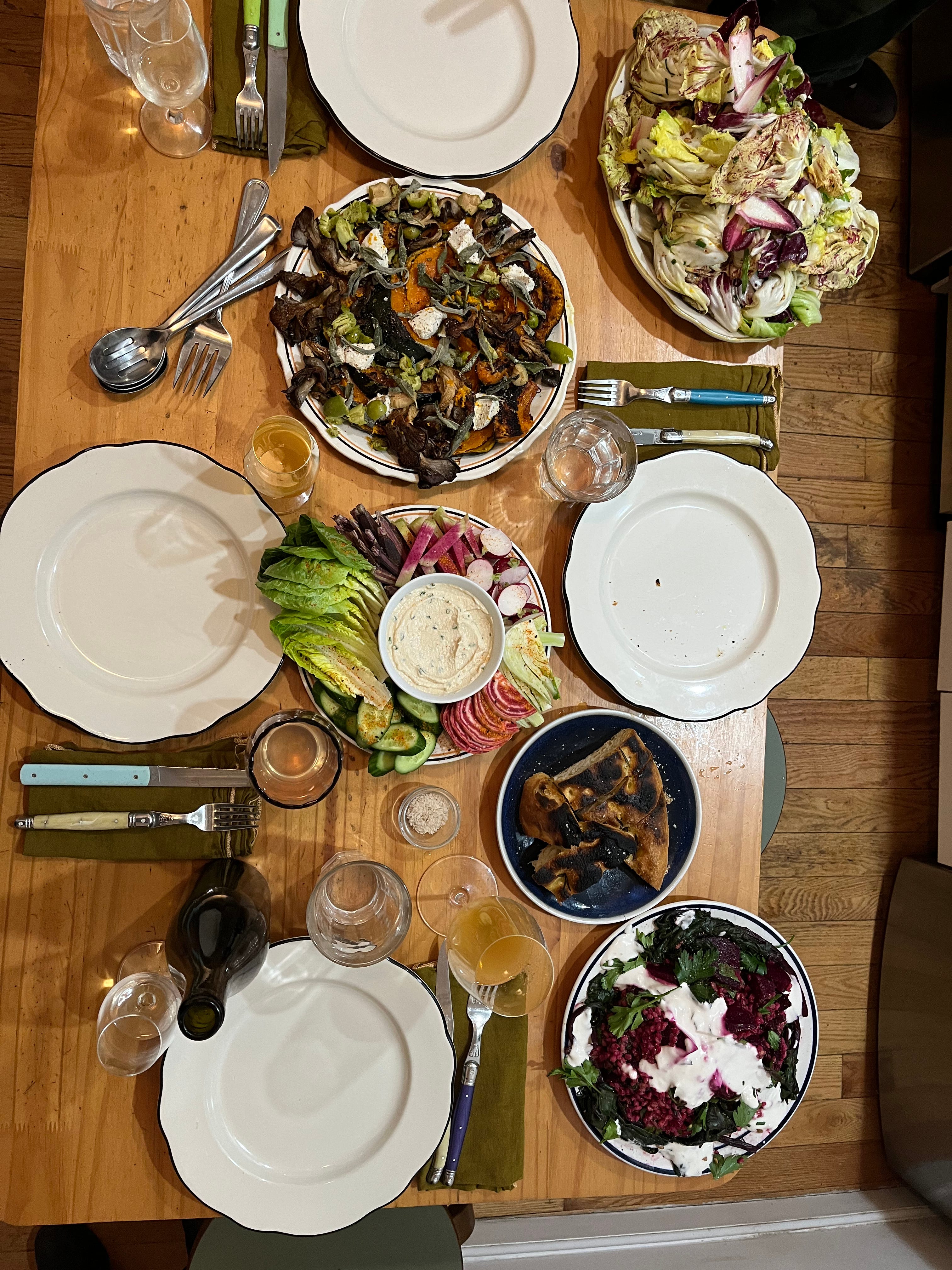 One random friday, instead of going out, I had a weird craving that only I could satisfy. I had been thinking of the combinations of the spicy Yemeni sauce zhoug/crispy mushrooms and kimchi/sour cream. Uncommon and disparate, but they came together. The mushrooms with roasted tomatoes, fresh tomatillos and a lot of cilantro. The kimchi and cream manifested on some broccolini and cute lil carrots. Kyle made a salad that he deemed as “California Winter Maximalist” lots of chicories, persimmon and avocado.